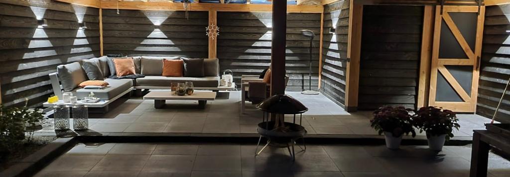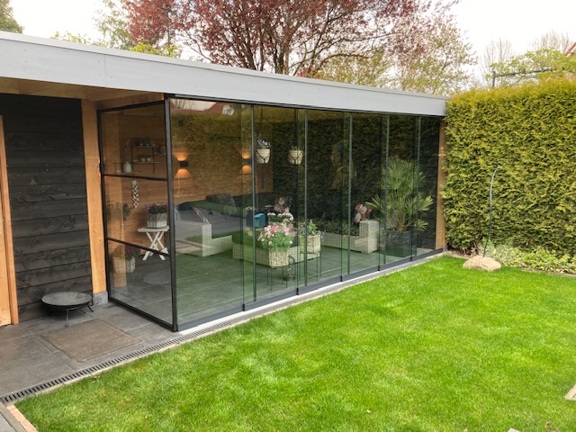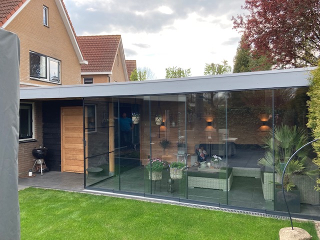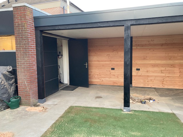 Overkapping met glazen deuren en een schuifdeur van zwart aluminium
