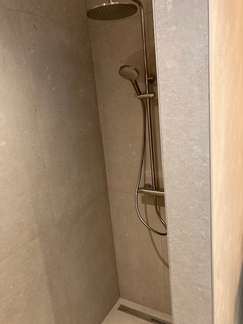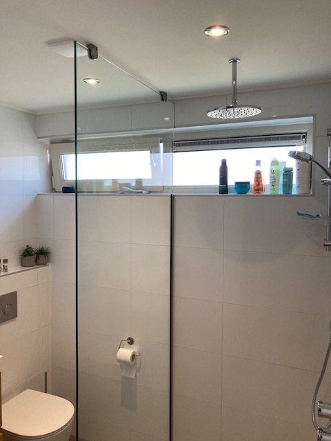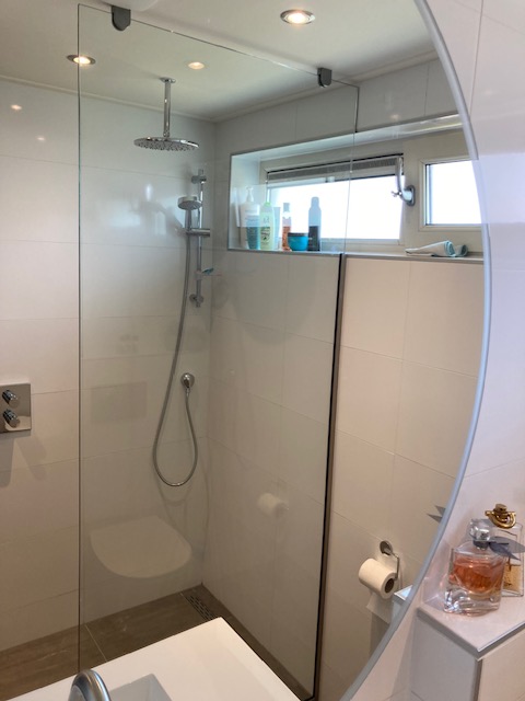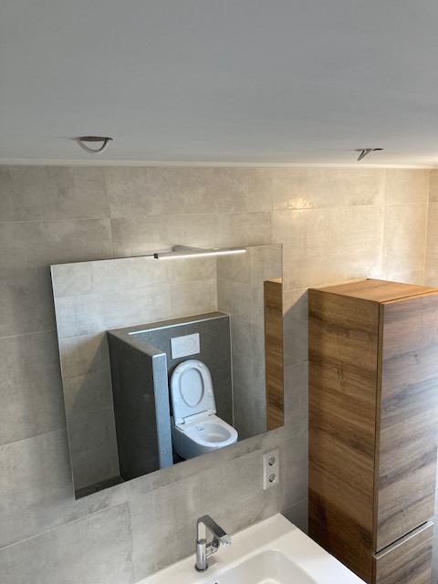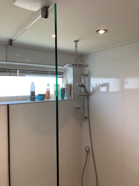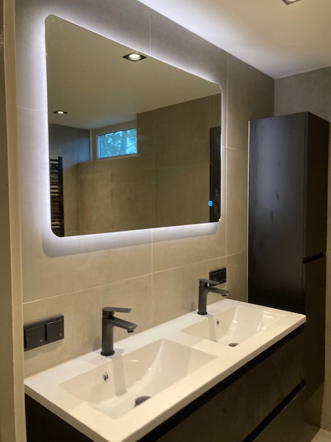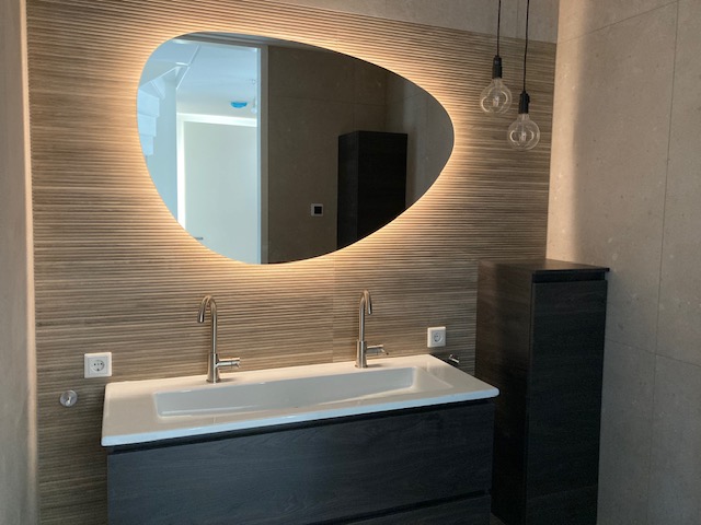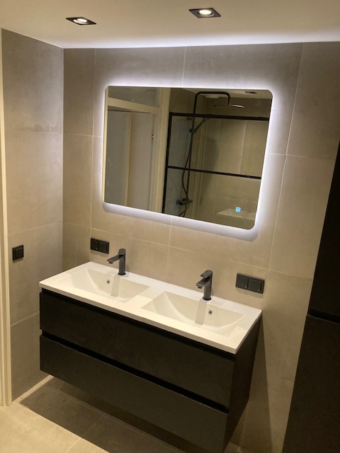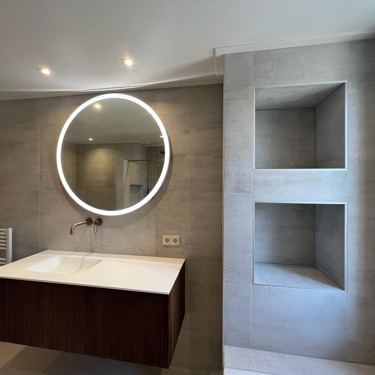 Badkamer met inbouwkranen, regendouche en spiegel met ledverlichting