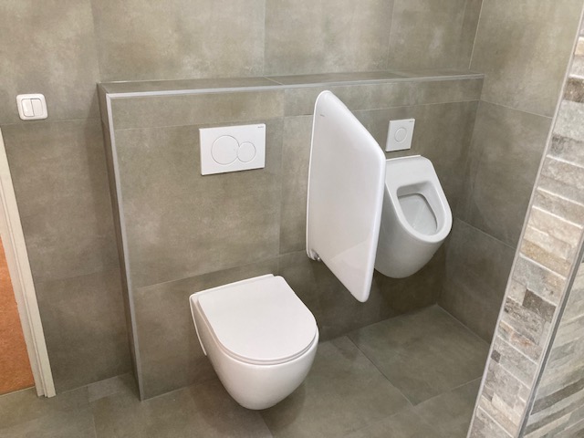 Badkamer met muurtje toilet en urinoir